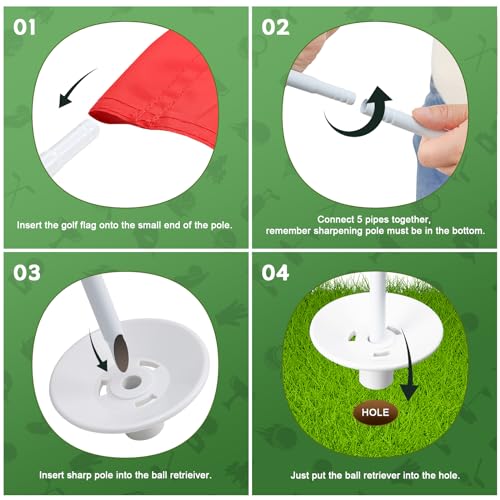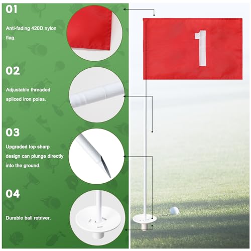 Easy to Install: Our golf flag for backyard is made of 5 section tubes with total height of 6 ft, and you can install different height according to your needs. You can also plunge flag pole with sharp end directly into the ground without ball retriever