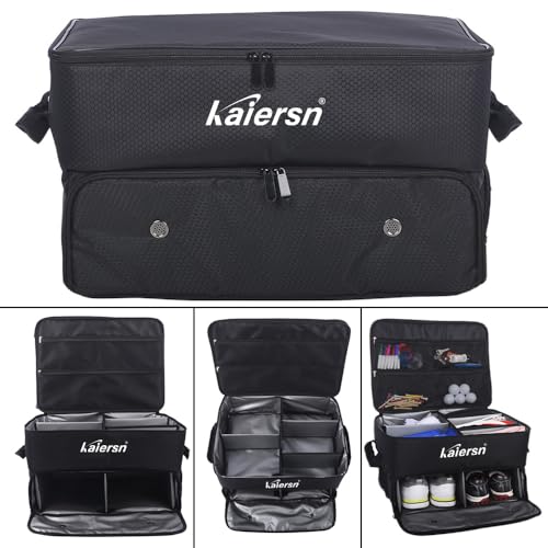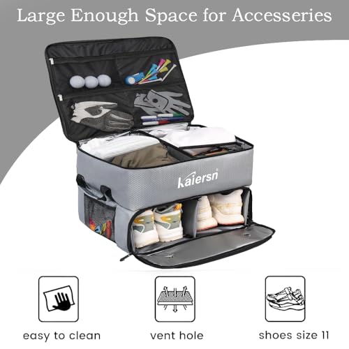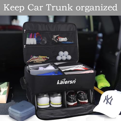 SEPARATE STORAGE FOR 2 SHOES: KAIERSN golf trunk organizer for car is upgraded on storage compartments, having separate shoes compartment on the bottom layer, to store 2 pairs of shoes up to size 11; The bottom compartment is with ventilated holes to keep air flowing around shoes; And the bottom storage space is made of polyester, which is easy to clean