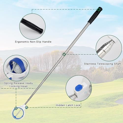 Golf Ball Retriever for Water Telescopic, 9 Ft Ball Retriever Tool Golf with Spring Release-Ready Head, Locking Clip, Non-Slip Ergonomic Handle, Aluminum Extendable Shaft