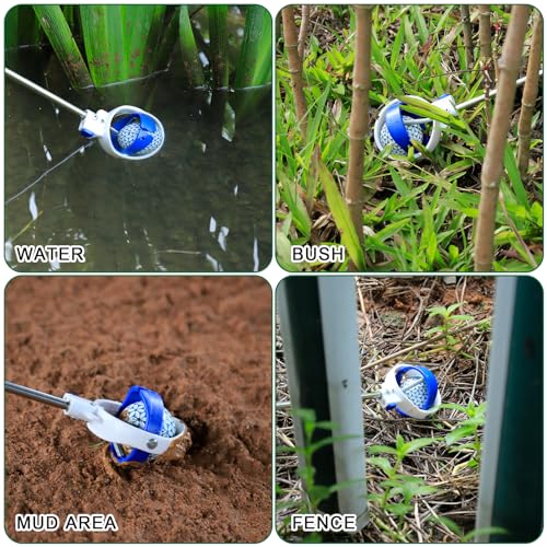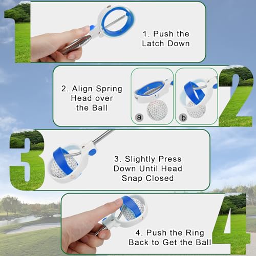SPRING RELEASE-READY HEAD: Just unlock the golf ball grabber latch and put the spring ring on the ball, the sensitive lock mechanism will automatically activate snaps around ball and grab it tightly when underwater, mud, boundary fence or thick bushes. And the white & bright color of the head is easy to distinguish location.